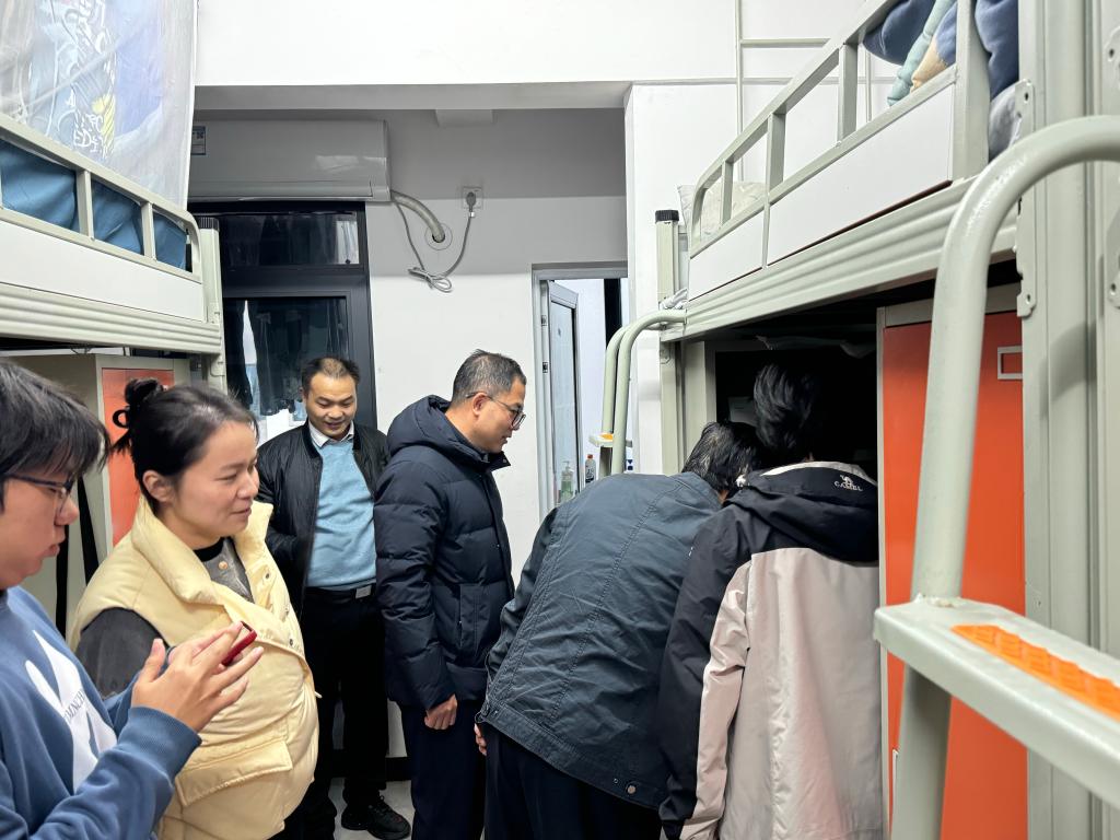 老师们走进升华25栋二楼男生寝室与同学们亲切交谈,询问冬季保暖、学业进展与日常生活情况。李涛鼓励同学们从小事做起、从现在做起、从自身做起,积极而为、努力作为,以寝室为阵地,营造勤学互助的优良学风,将寝室建设成充满书香、墨香的学习园地;学习之余将自己的生活安排得丰富多彩。仲文明重点关心寝室设施保障,了解大家是否有生活困难,并鼓励大家发展兴趣爱好,凝聚同窗情谊。侯合余着重强调安全纪律,叮嘱同学们规范使用电器,保持环境卫生,共同筑牢寝室安全防线。