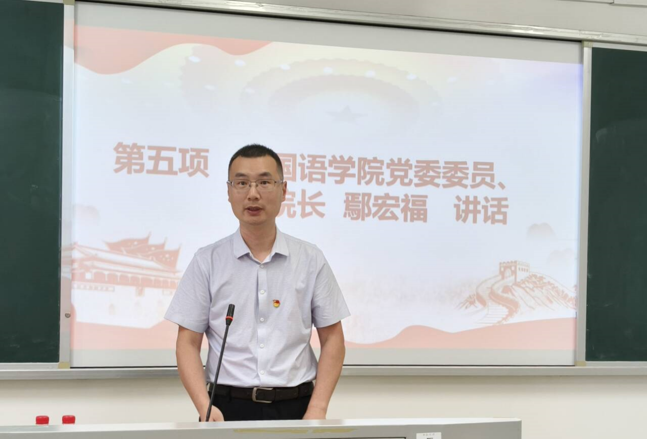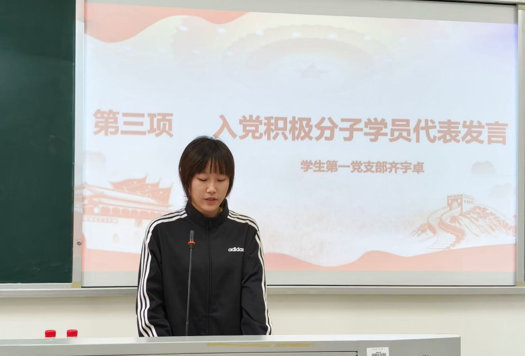 其后,来自学生第一党支部的齐宇卓作为入党积极分子培训班学员代表发言。她表示,身为外语专业学生,她深切体悟到在跨文化交流的浪潮中,党的指引如同照亮前路的灯塔,为文化传播事业锚定了航向。语言学习者一定要将党的指引内化于心、外化于行,才能勇担文化传播使命。她也代表全体学员庄严表示,将认真严肃对待每一堂课、每一次研讨,潜心学习钻研党的理论,在深学细悟中提升思想境界与理论素养,更加坚定跟着中国共产党走的信心和决心。