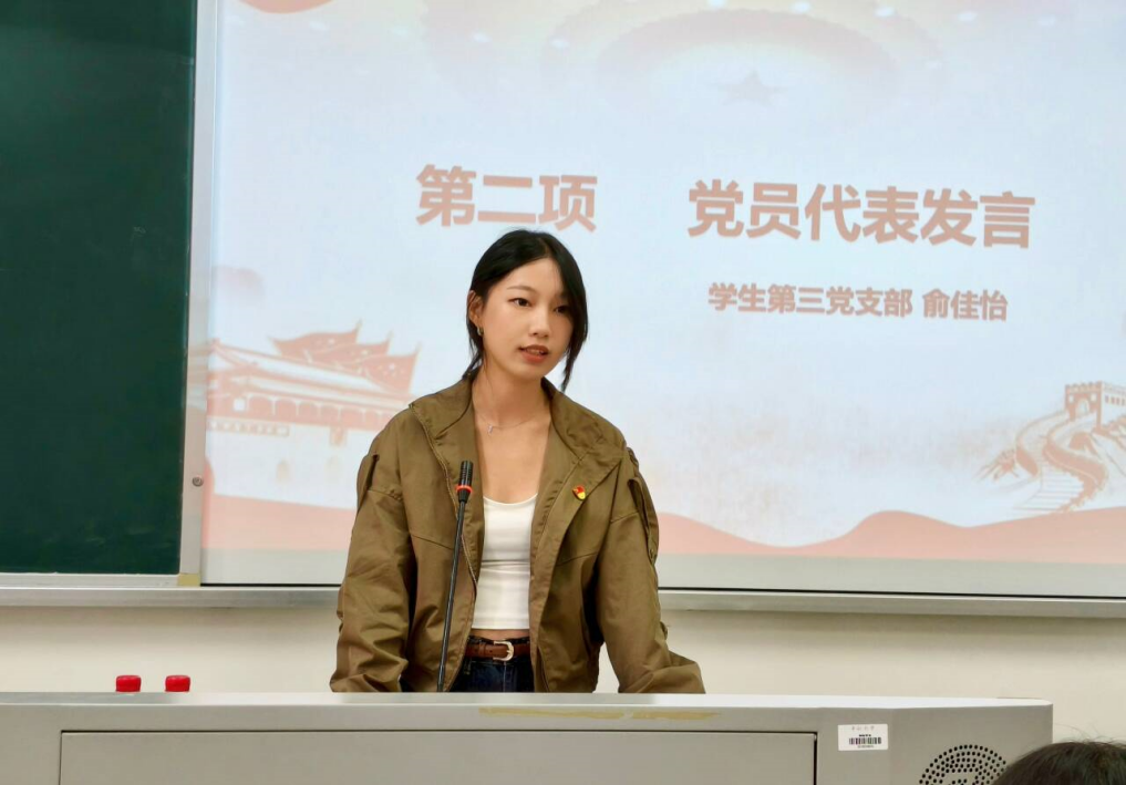 接着,来自学生第三党支部的俞佳怡作为党员代表发言。作为一名预备党员,俞佳怡回望入党积极分子培训时光,认为入党积极分子培训不仅是理论学习的过程,更是思想洗礼、精神淬炼的过程。她对新学员恳切建议,大家要珍惜学习机会,深入学习党章党规和党的创新理论;要理论结合实践,以党员标准要求自己,履职服务践宗旨;要保持进取,不畏困难,主动汇报思想,坚定向党组织靠拢。