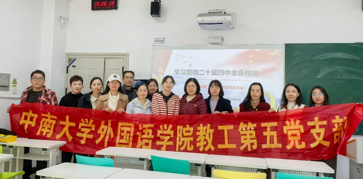 11月19日,教工第五党支部在外语院南楼108召开全体党员大会,专题学习贯彻党的二十届四中全会精神,并就如何将会议精神融入实际工作进行深入研讨。会议由党支部书记谢芸主持。 会议首先聚焦于二十届四中全会精神的学习领会。支部副书记邱香玲、纪检委员冯树元两位同志为全体党员讲授了题为《学习贯彻党的二十届四中全会精神》的专题党课。党课系统梳理了全会的主要内容和核心要义,帮助党员们进一步了解了党的二十届四中全会的...